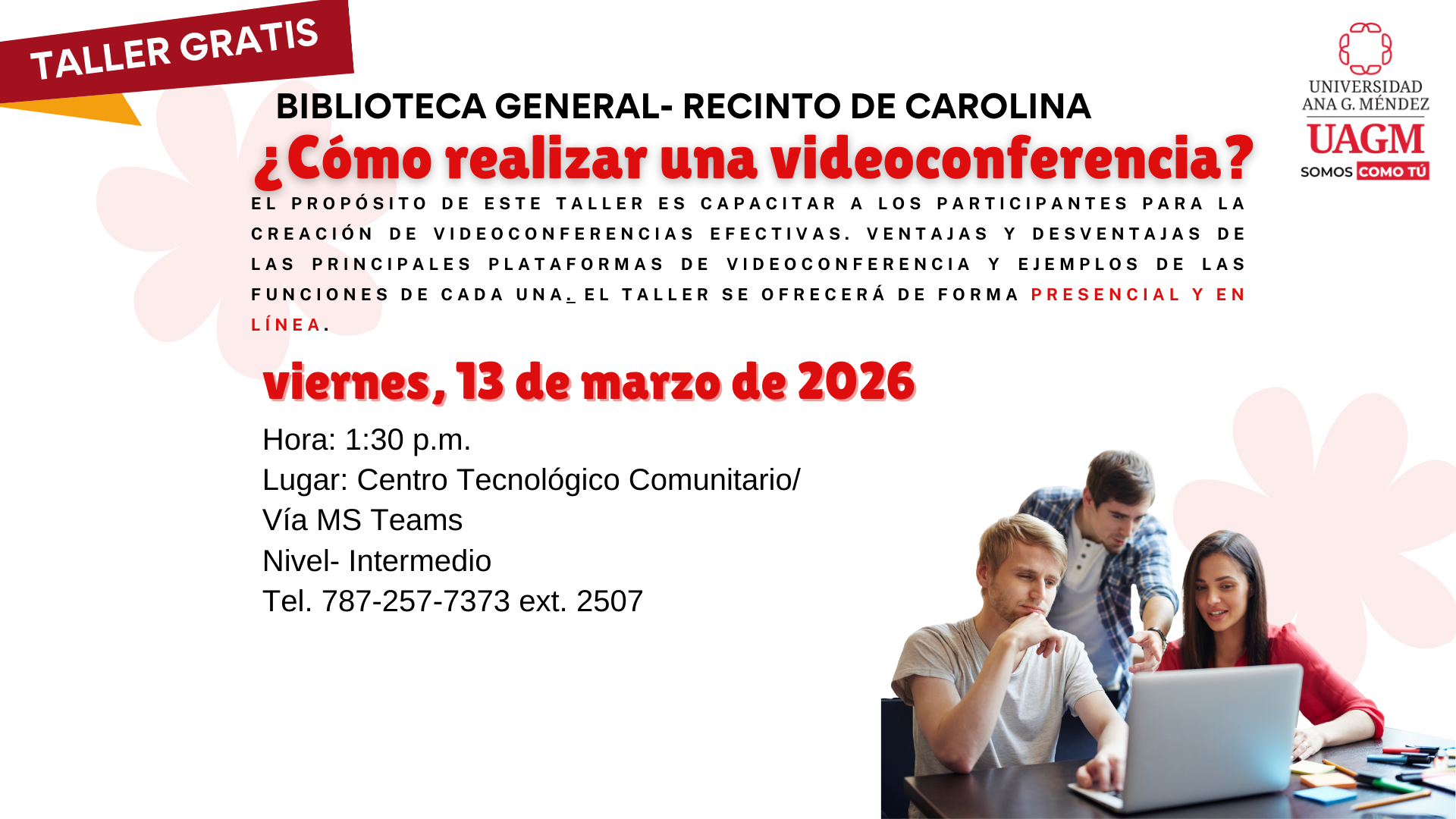 La Biblioteca General de la Universidad Ana G. Méndez, Carolina, invita a la comunidad universitaria a participar de este taller ¿Cómo realizar una videoconferencia?, enfocado en la creación de videoconferencias efectivas. Durante el taller se discutirán las ventajas y desventajas de las principales plataformas de videoconferencia, así como ejemplos de las funciones que ofrece cada una. El taller se ofrecerá de forma presencial y en línea.