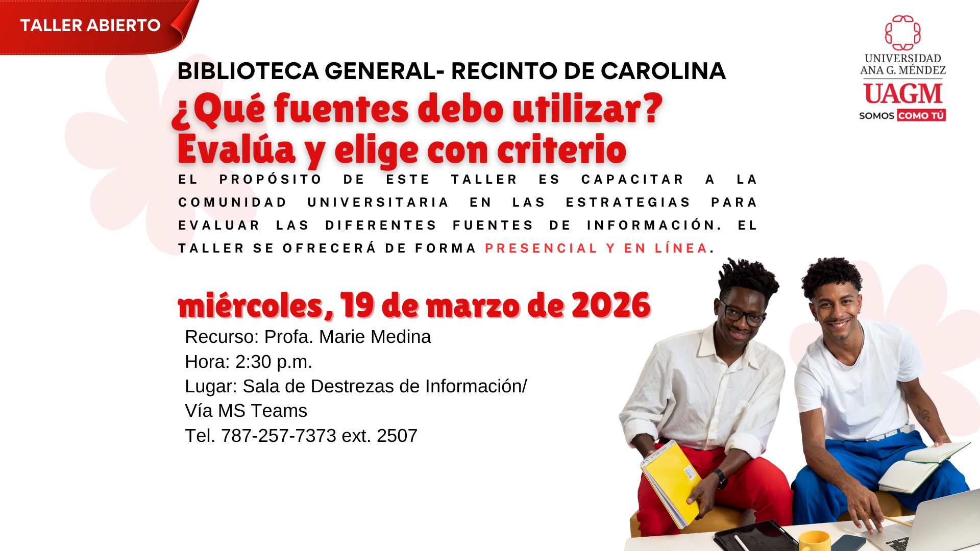 La Biblioteca General de la Universidad Ana G. Méndez, Carolina, invita a la comunidad universitaria a participar del taller ¿Qué fuentes debo utilizar? Evalúa y elige con criterio. El propósito de este taller es capacitar a la comunidad universitaria en las estrategias para evaluar las diferentes fuentes de información. El taller se ofrecerá de forma presencial y en línea.
