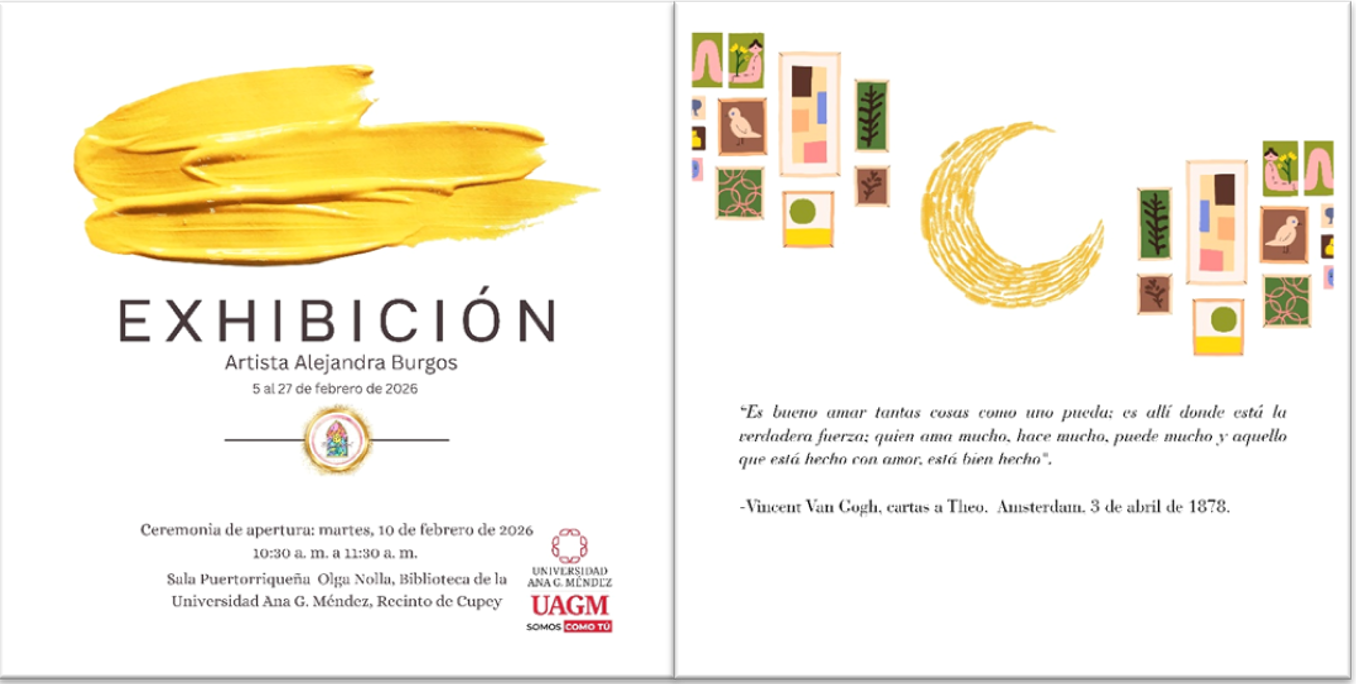 La Biblioteca del Recinto de Cupey invita a toda la comunidad académica de la UAGM y al público en general a la ceremonia de apertura de la Exhibición de Arte Alejandra: La Sombrilla Amarilla, de la estudiante Alejandra Burgos Sotomayor.